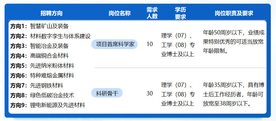 1.应聘项目首席科学家岗位(岗位序号1),年龄50周岁以下(1974年9月1日之后出生),业绩成果特别优秀的可适当放宽年龄限制;